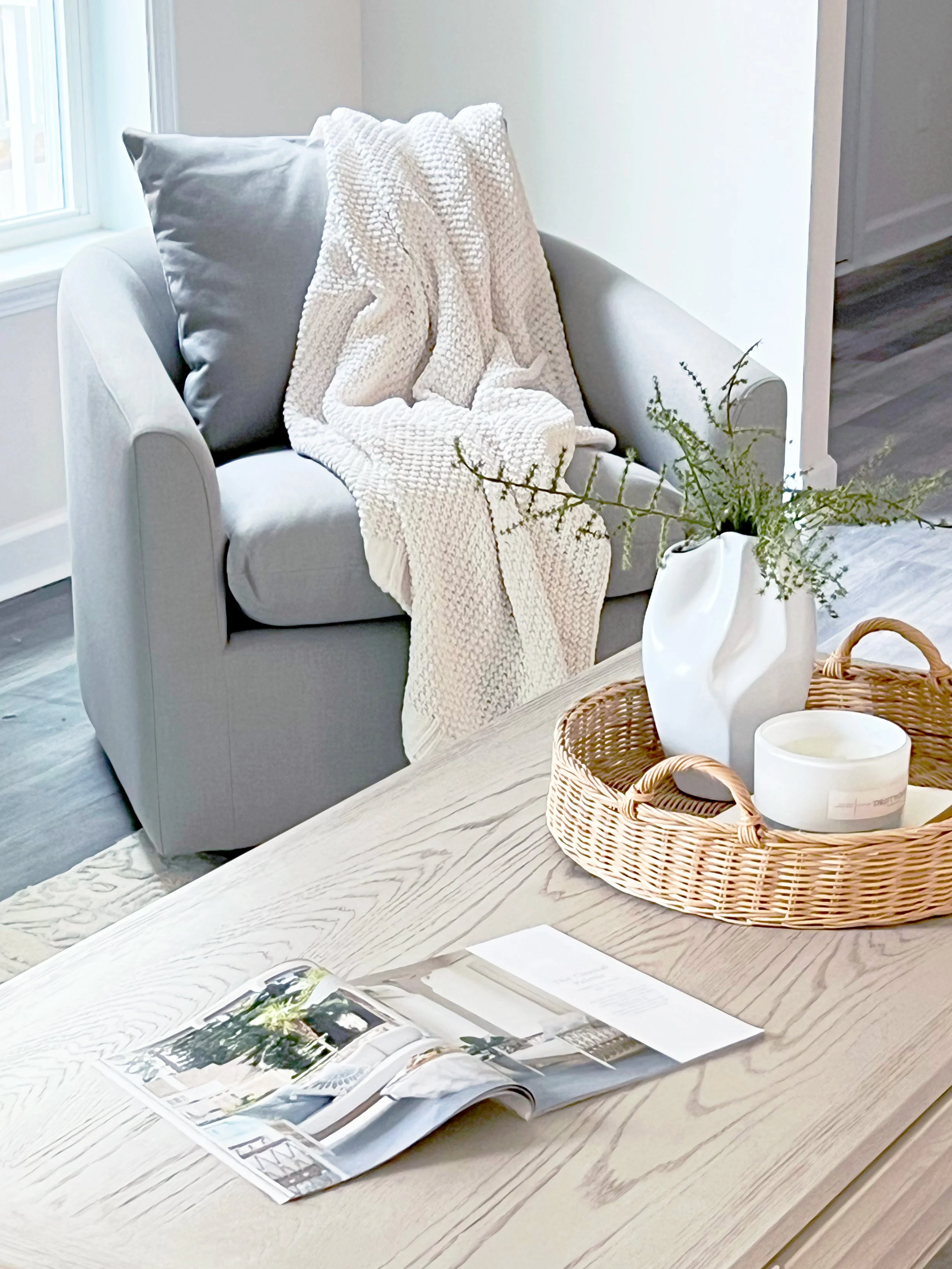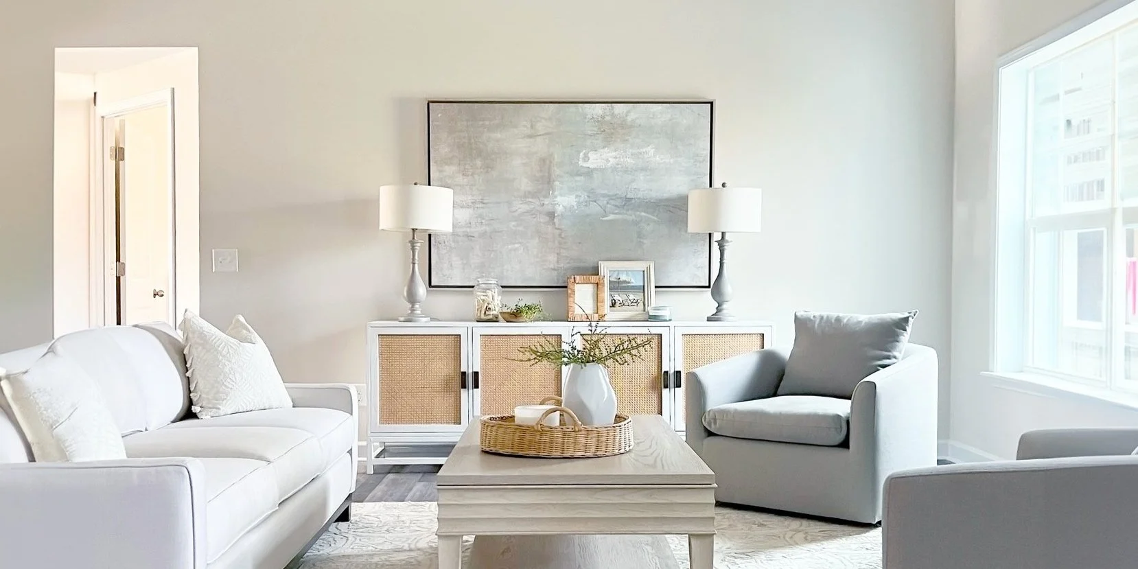 "For Forest Ridge, I knew I wanted furniture that was both stylish and versatile," she says. "Military families often have diverse tastes, so I chose transitional pieces with clean lines and neutral tones that could easily adapt to different design tastes." Understanding the home’s location was first-and-foremost a beach town, Alexis also placed woven rattan furniture and pieces of driftwood throughout the home to add some coastal flair without being overly thematic.